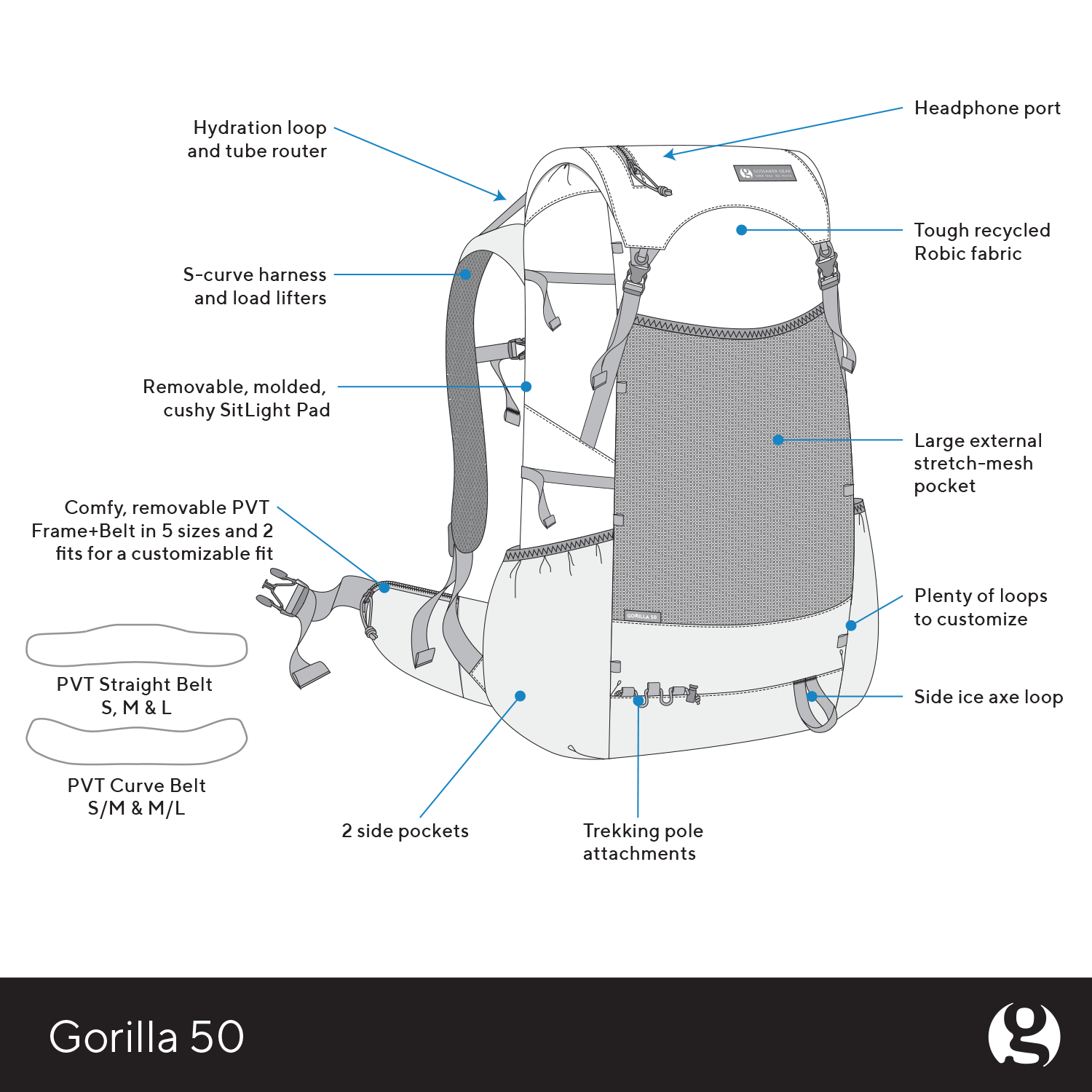 Enjoy our signature PVT Frame+Belt: an aluminum, closed-shape frame and pivoting hipbelt that allow your pack to move with your natural gait for maximum comfort. The Gorilla's S-curve harness and load lifters carry your haul with even distribution. You also get ample external pockets and a quick-access, fold-over lid to hold as many bananas as you see fit.